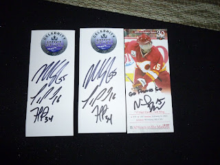 I forgot my Stoll number kit, almost turned around to drive 50 mins to get it but choose a different route. I got a #1 to get Jarret to sign, totally forgot about it Jarret signed my Kings jersey but growl....When we got there there was a bout 30 people in line, I was a little miffed but oh well...I walked inside to use the washroom and when I walked out I noticed someone standing off to the side of Boston Pizza. People were line up right in front of Nigel Dawes of my Calgary Flames. I walked over and said I knew who he was and asked how he was. We chatted for about 5mins about my beloved Flames, shared some tears, no kidding. But walked back to the line and had a large grin on my face. I told my wife who I met and she just rolled her eyes. She loves the Flames too but the chances I get just make her sigh. I ended up with a Hartnell jersey, Team Canada jersey, and the Kings jersey but will post the pics tomorrow.